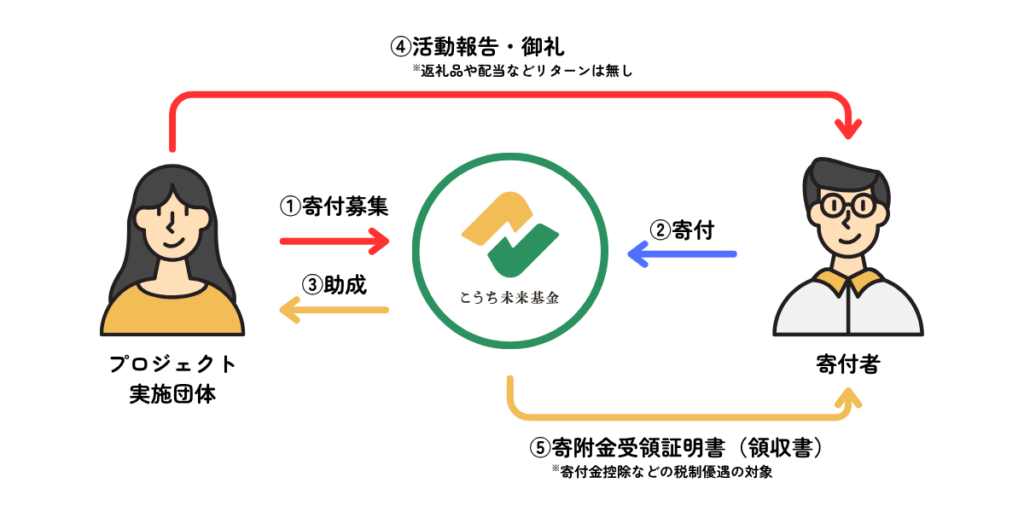 高知県内で公益的な取組を行う団体が、当基金の仕組みを活用して自ら寄付を募ることができ、その想いに共感した人々が寄付というかたちで活動を応援します。集まった寄付金は、活動の継続や新たなチャレンジのために活用できます。(※税制優遇・WEB決済システムなど)