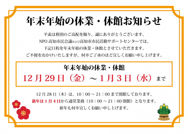平素は格別のご高配を賜り、誠にありがとうございます。 NPO高知市民会議および高知市市民活動サポートセンターでは、下記日程を年末年始の休業・休館とさせていただきます。 ご不便をおかけいたしますが、何卒ご了承のほど宜しくお […] -